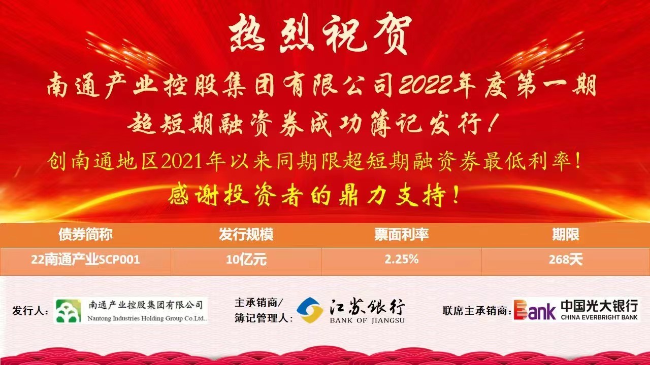 5月24日,產(chǎn)控集團(tuán)成功發(fā)行10億元超短期融資券。由于產(chǎn)控集團(tuán)的良好資質(zhì)得到投資者的高度認(rèn)可和踴躍認(rèn)購(gòu),發(fā)行利率僅為2.25%,創(chuàng)南通地區(qū)2021年以來同期限超短期融資券的最低利率!