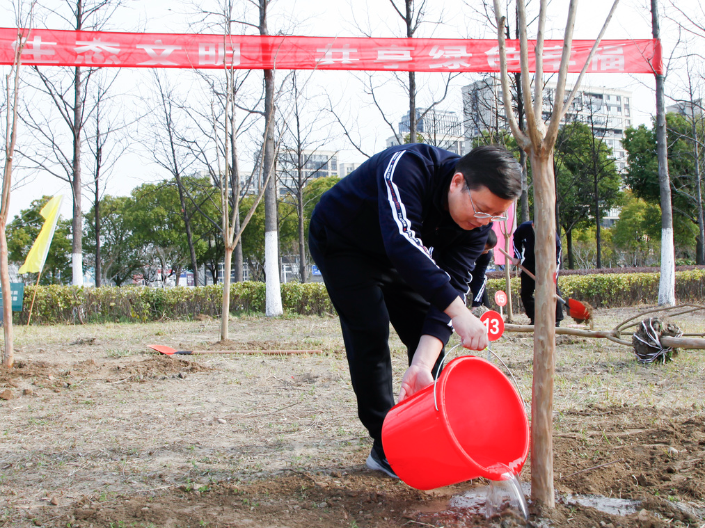 春風(fēng)和煦,萬物萌生,在位于通呂運(yùn)河綠廊星島水岸段的植樹現(xiàn)場(chǎng),張劍橋董事長(zhǎng)、顧建國(guó)總經(jīng)理與集團(tuán)其他領(lǐng)導(dǎo)帶領(lǐng)大家一起熱火朝天地?fù)]鍬鏟土、扶苗填坑、培實(shí)新土、提水灌溉。大家熱情高漲、干勁十足、二三人一組、分工協(xié)作,共同種下50余棵紫薇樹苗,牢固樹立和踐行了“綠水青山就是金山銀山”的理念,為推進(jìn)新時(shí)代生態(tài)文明建設(shè)、建設(shè)美麗南通貢獻(xiàn)產(chǎn)控力量。